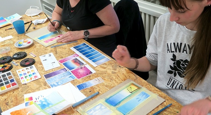 Malbu záložek a akvarelových „polaroidů“ s oblohou všech barev, k dispozici budou na výběr předlohy a nafocené postupy.