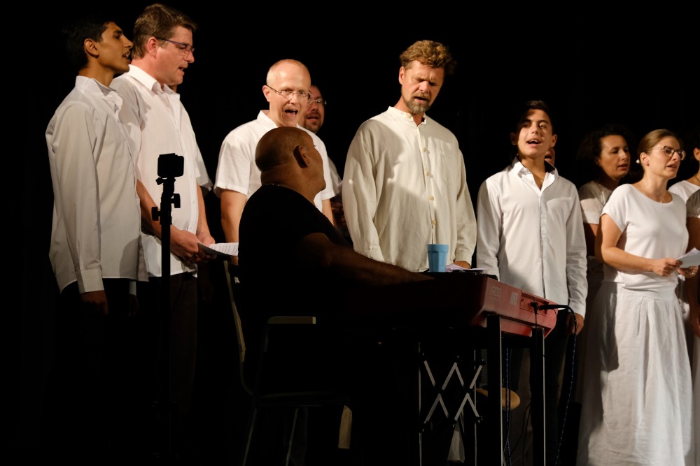 Sbor 42 zpěváků rozezněl sál. Zaznělo 12 romských písní převážně z dílny Desideria Duždy, který sbor doprovázel na klavír a který byl spolu se svou ženou Idou Kelarovou hlavním lektorem workshopu.